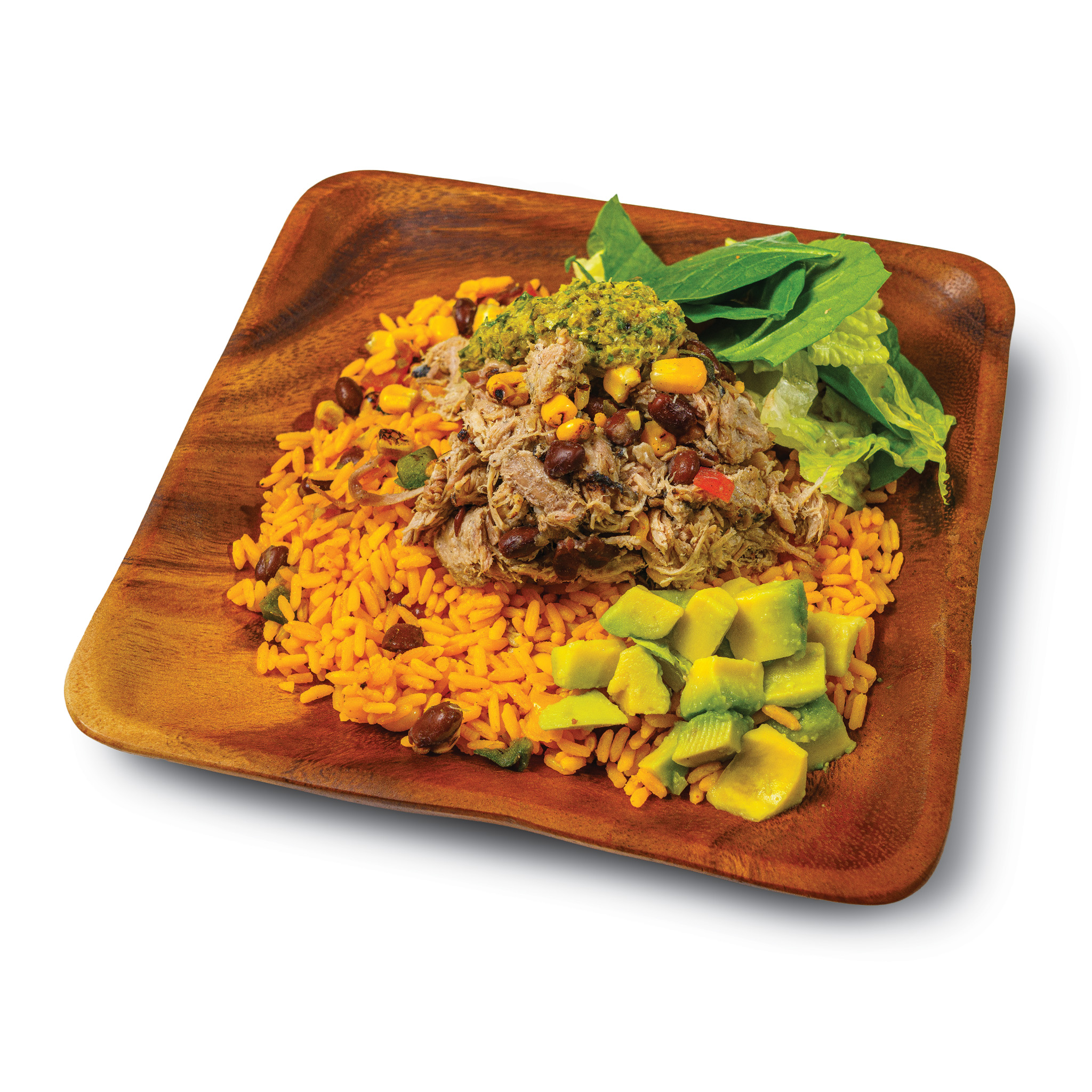 Pork Yellow Rice Black Beans Tomato Corn Avocados Poblano Pepper Cilantro Garlic Jalapeno Spinach Scallions Oil Blend Lettuce Onions Lime